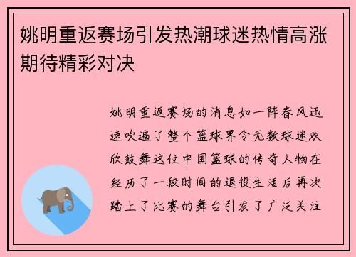 姚明作为中国篮球的代表性人物,他不仅在球场上取得了辉煌的成就,也在推动中国篮球的发展和社会影响方面发挥了重要作用。本文将从四个方面探讨姚明眼中的中国篮球发展与未来展望,分别是专业化与市场化、青少年培养体系、社会责任与文化传播,以及国际化视野。通过这些方面,我们将深入了解姚明如何看待中国篮球的现状,以及他对未来发展的期许与构想。这些观点不仅反映了他的个人经历,也揭示了中国篮球在全球舞台上的潜力和机遇...