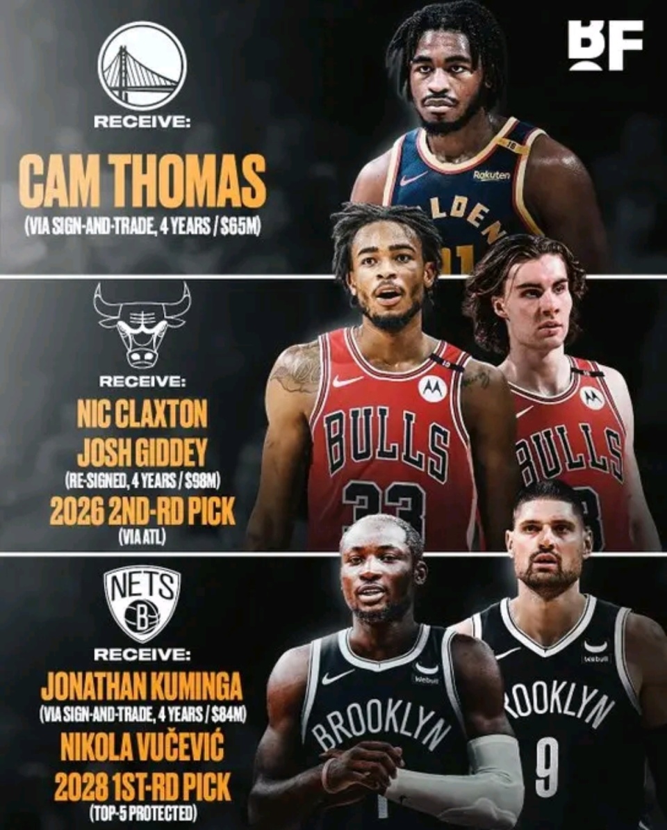 布鲁克林篮网获得:乔纳森库明加(4年8400万先签后换)+尼古拉武切维奇+2028年公牛首轮签(前五保护)。